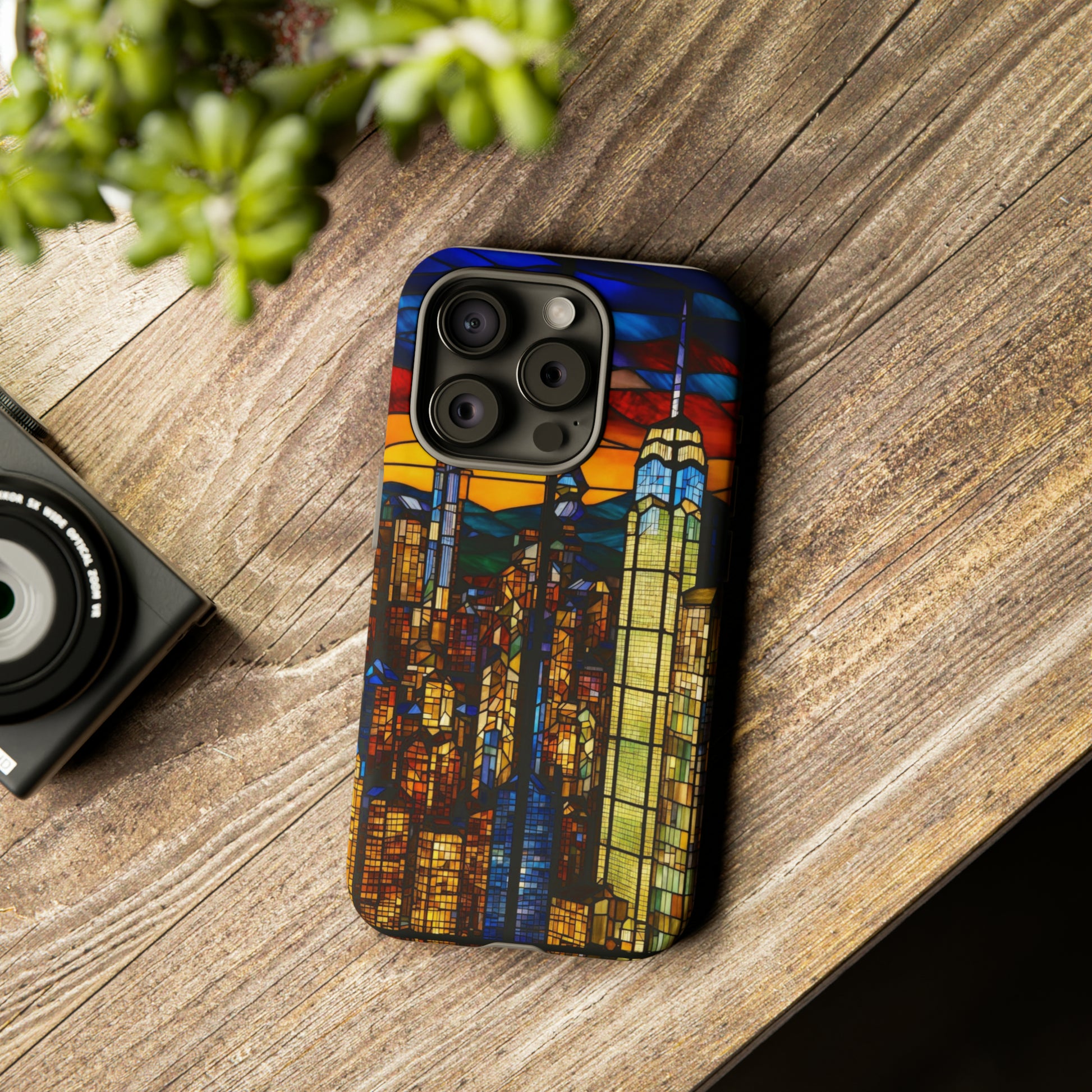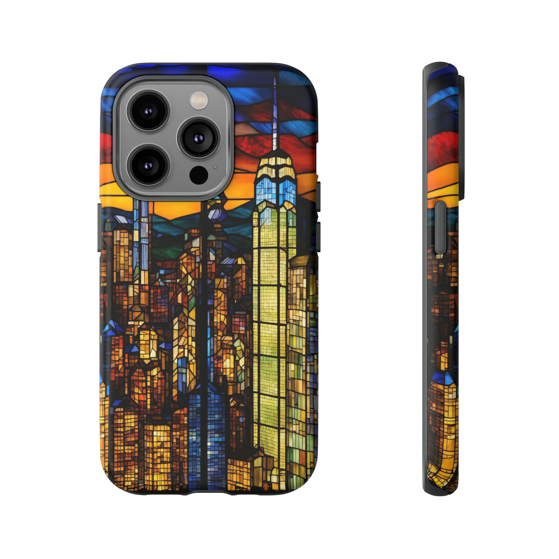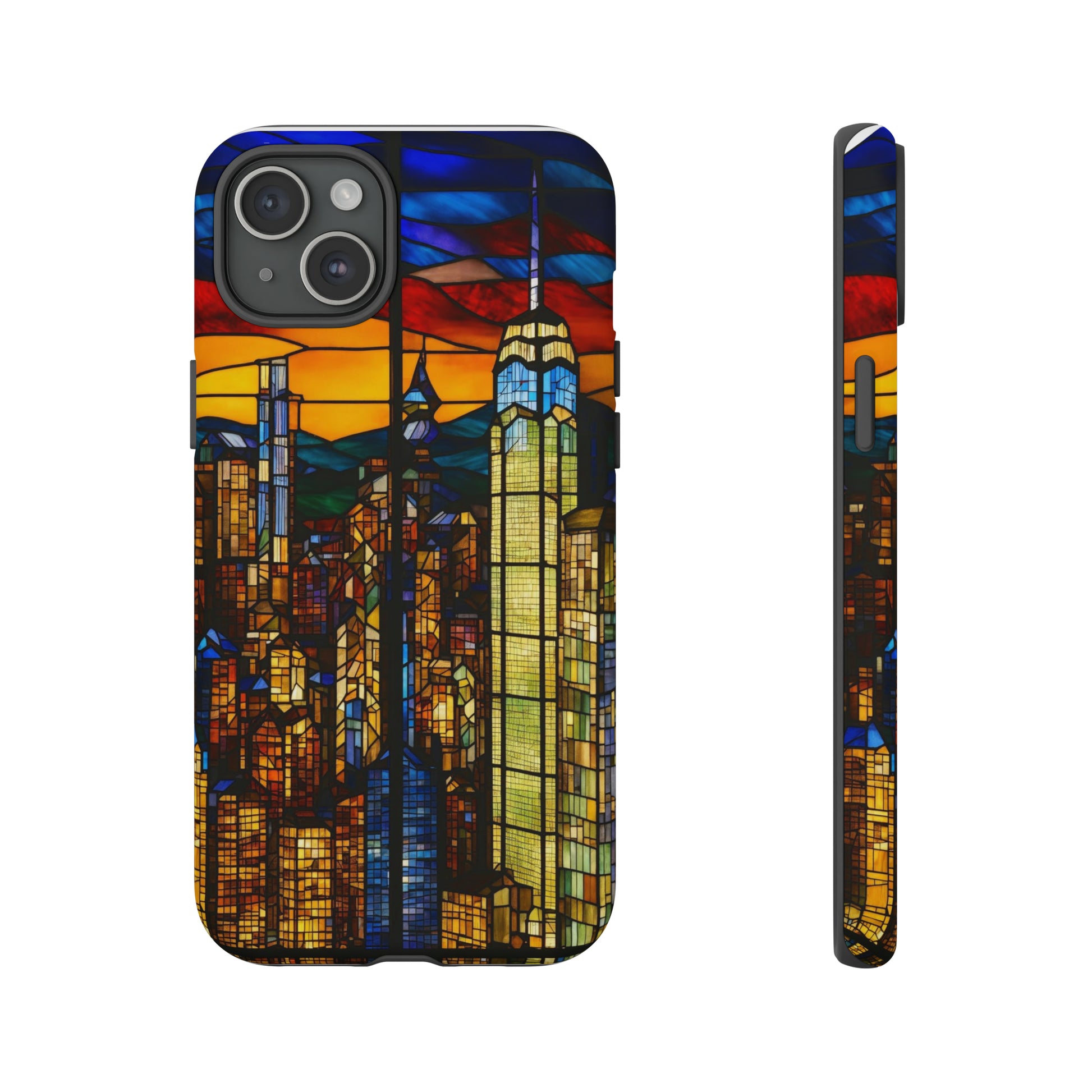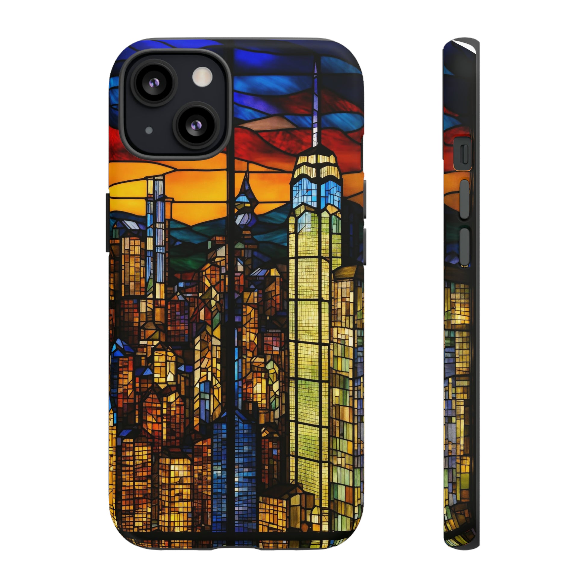 Personalize your Apple iPhone devices with our premium-quality custom protective phone cases a City Skyline at dusk in Stained Glass design. Every case has double layers for extra durability and protection. The outer polycarbonate shell will resist daily impacts. Our beautiful design, and we'll print it in picture-perfect quality with a glossy or matte finish.